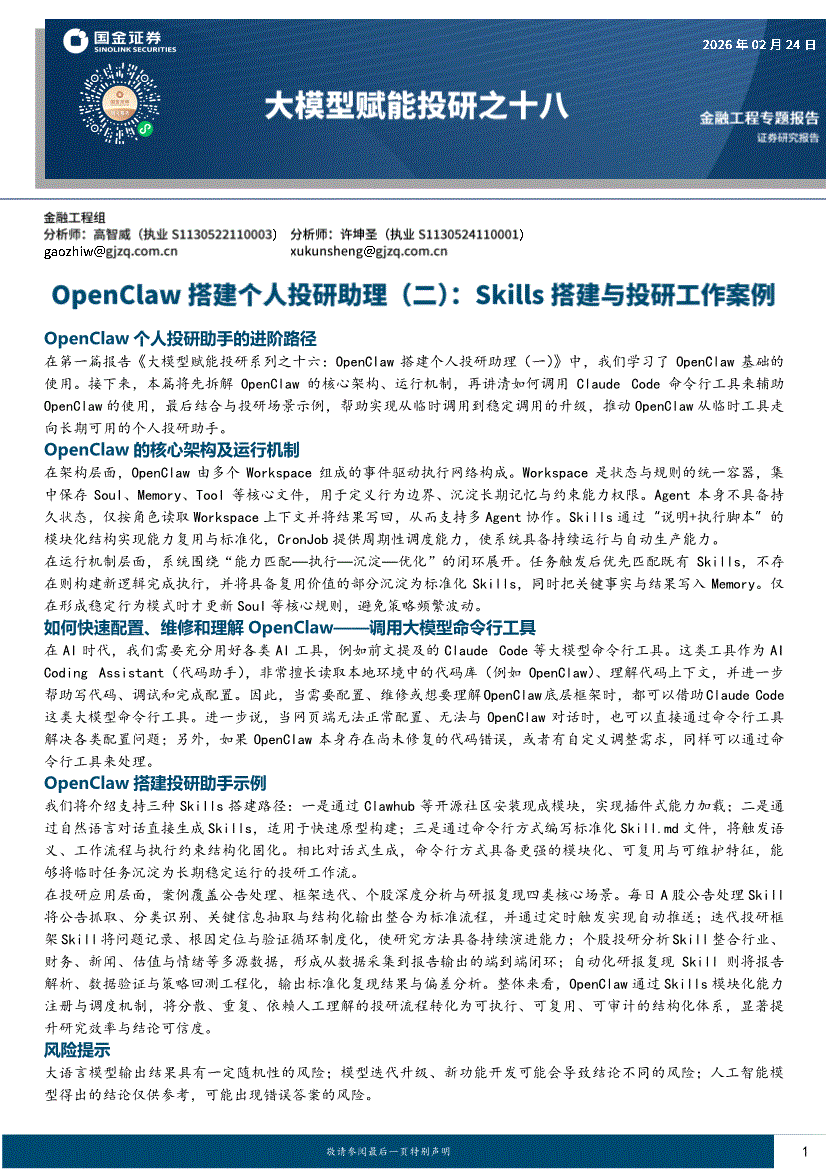 国金证券-大模型赋能投研之十八:OpenClaw搭建个人投研助理(二),Skills搭建与投研工作案例-260224