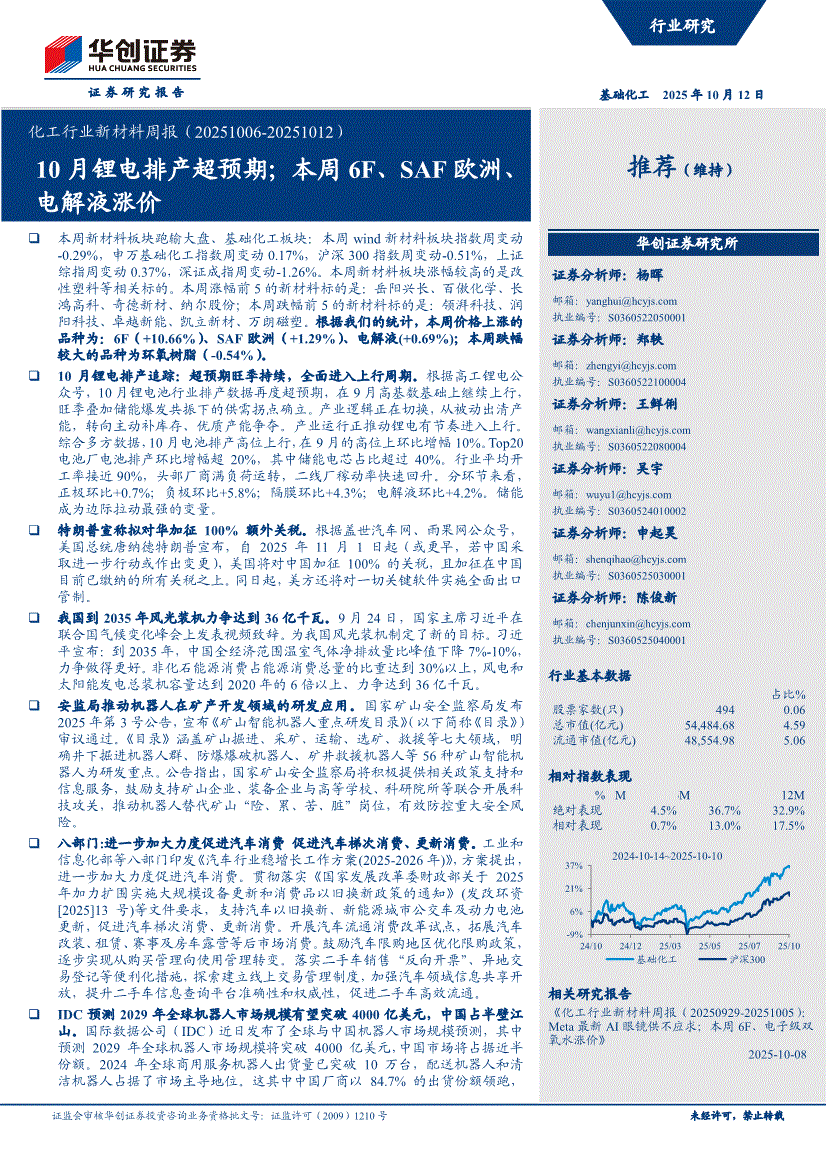 化工行业:华创证券-化工行业新材料周报:10月锂电排产超预期;本周6F、SAF欧洲、电解液涨价-251012