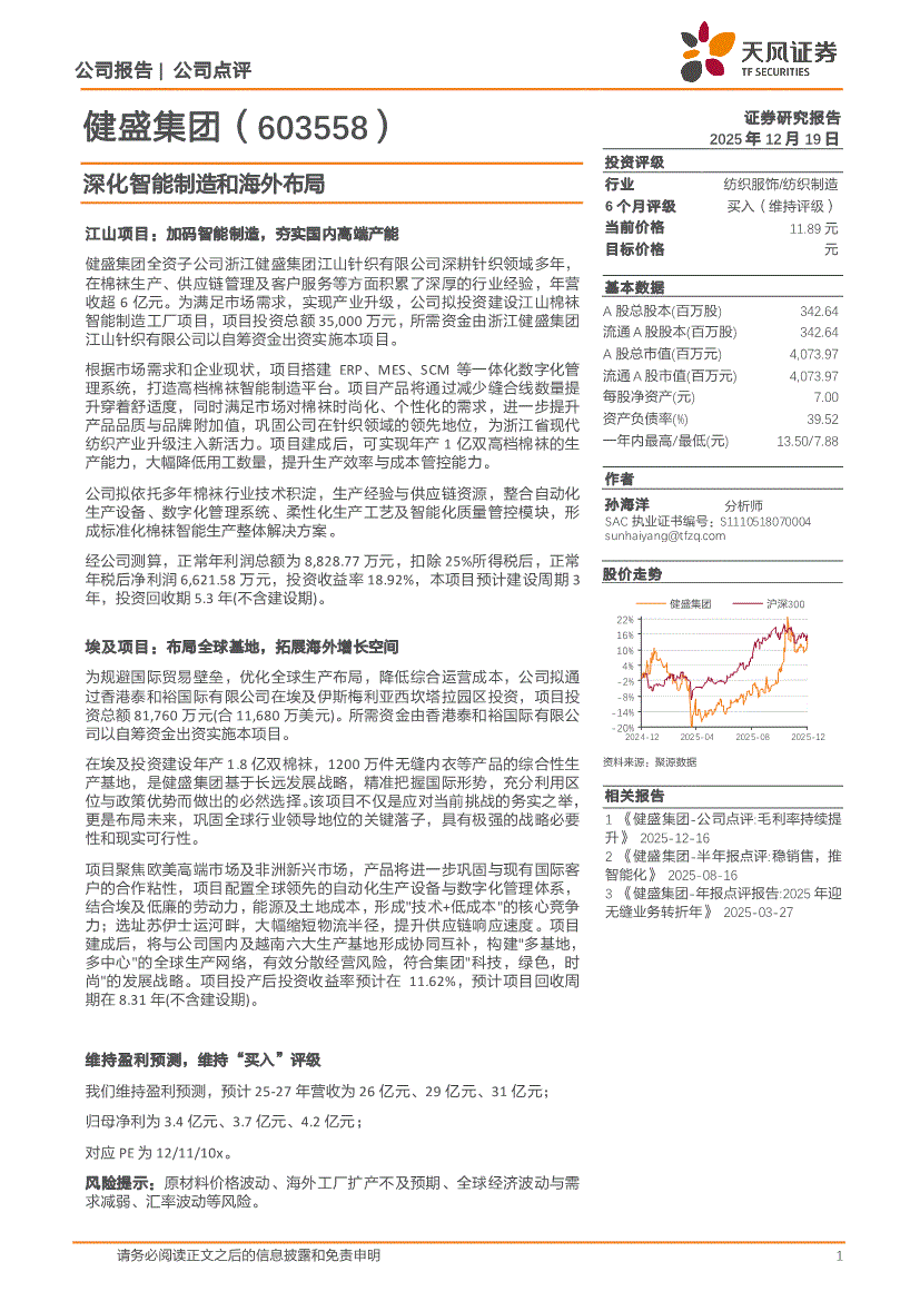 健盛集团:天风证券-健盛集团-603558-深化智能制造和海外布局-251219