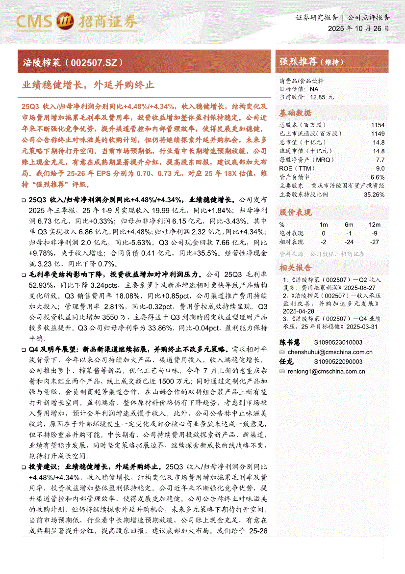 涪陵榨菜:招商证券-涪陵榨菜-002507-业绩稳健增长,外延并购终止-251026