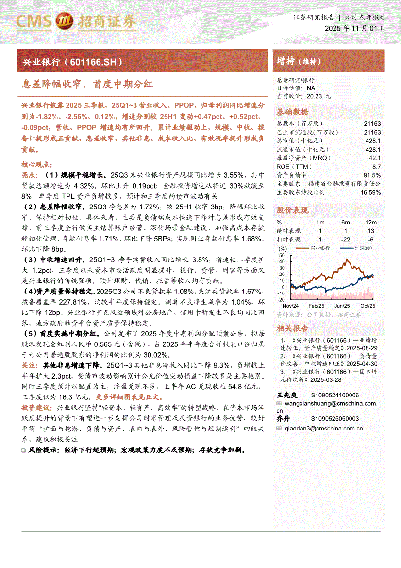 兴业银行:招商证券-兴业银行-601166-息差降幅收窄,首度中期分红-251101