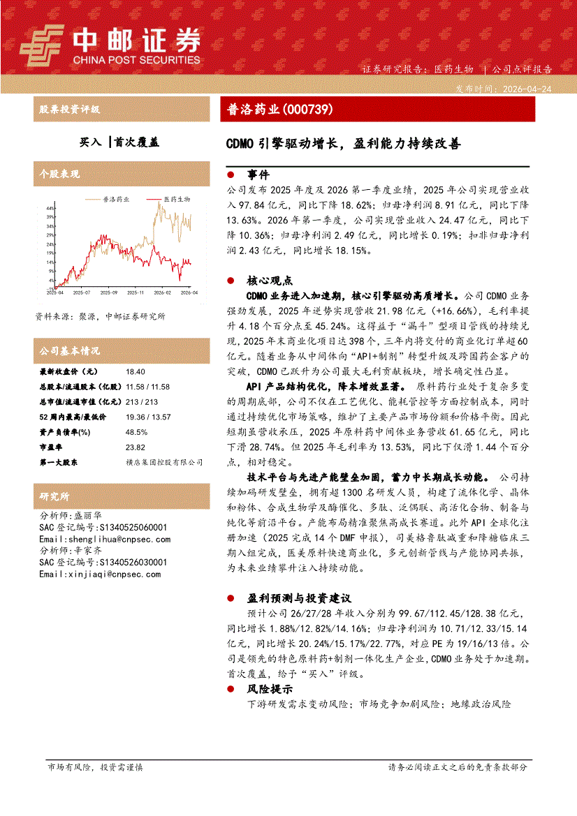 普洛药业:中邮证券-普洛药业-000739-CDMO引擎驱动增长,盈利能力持续改善-260424