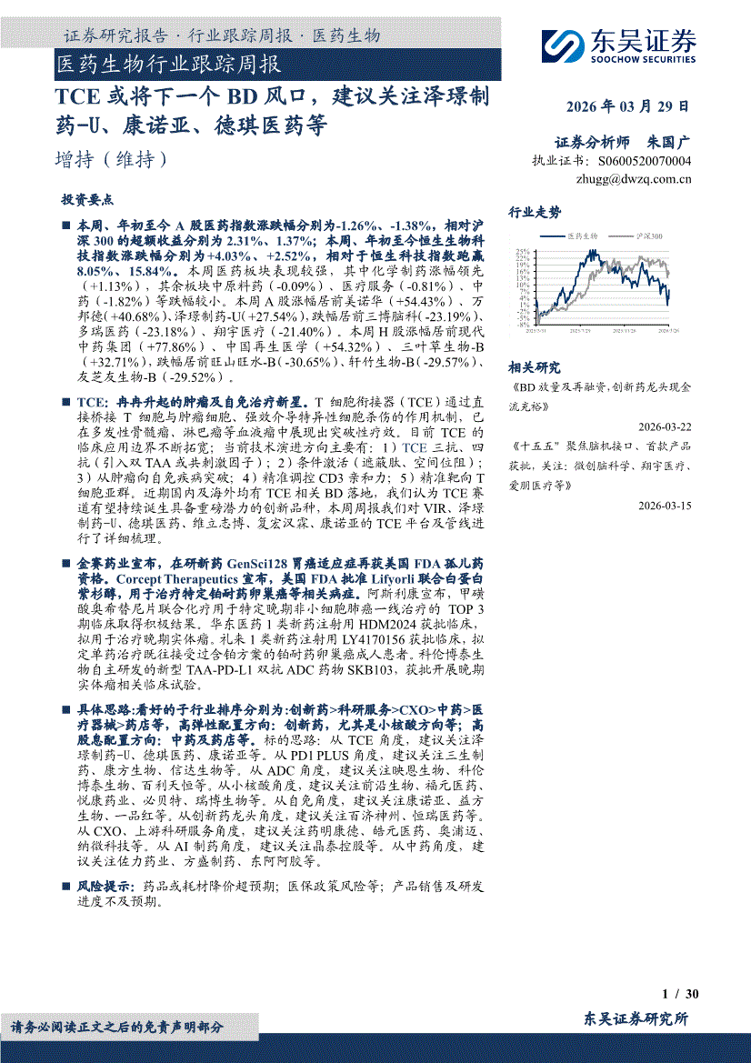 医药生物行业:东吴证券-医药生物行业跟踪周报:TCE或将下一个BD风口,建议关注泽璟制药~U、康诺亚、德琪医药等-260329