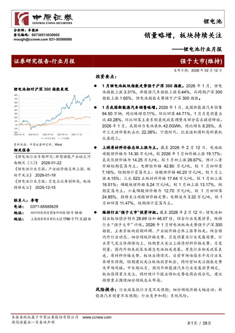 锂电池行业:中原证券-锂电池行业月报:销量略增,板块持续关注-260212