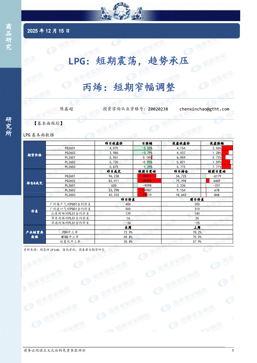 国泰君安期货-LPG:短期震荡,趋势承压,丙烯,短期窄幅调整-251215