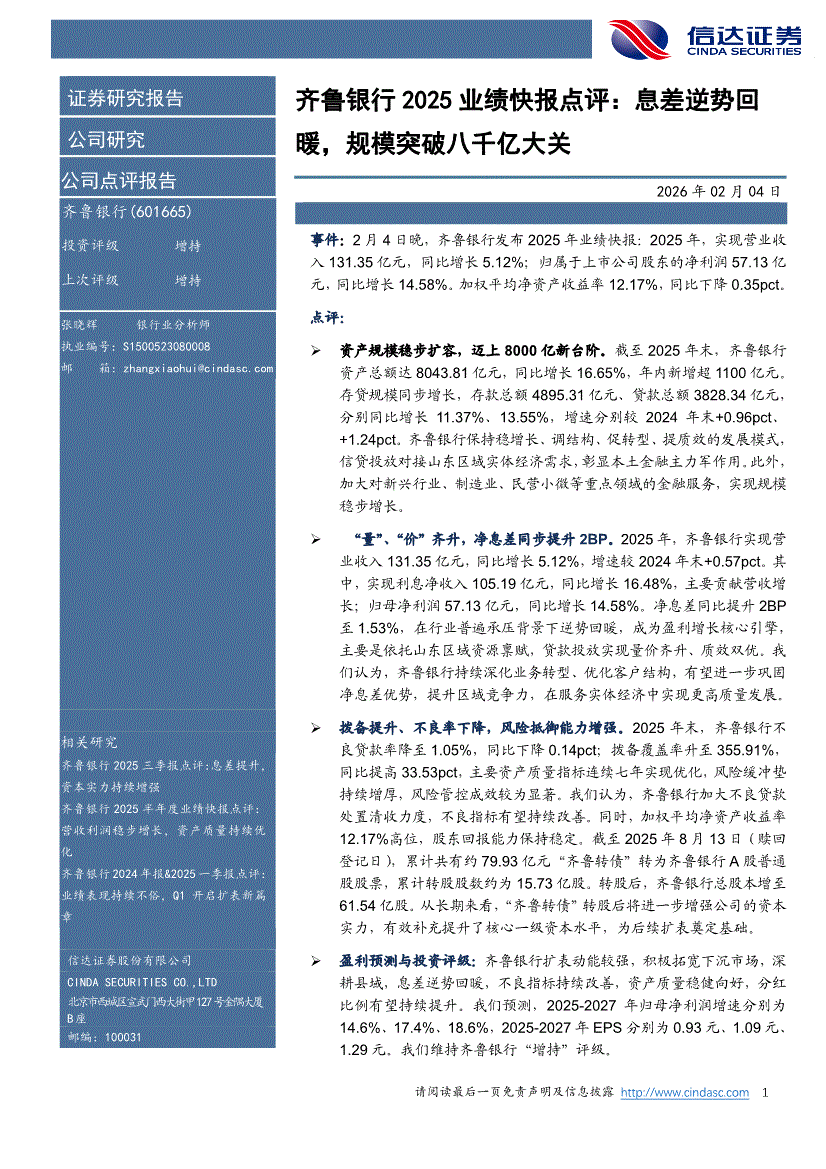 齐鲁银行:信达证券-齐鲁银行-601665-2025业绩快报点评:息差逆势回暖,规模突破八千亿大关-260204