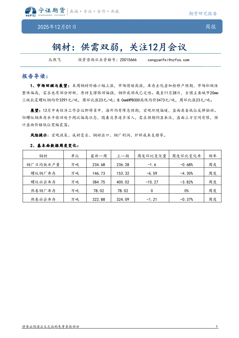 宁证期货-钢材周报:供需双弱,关注12月会议-251201