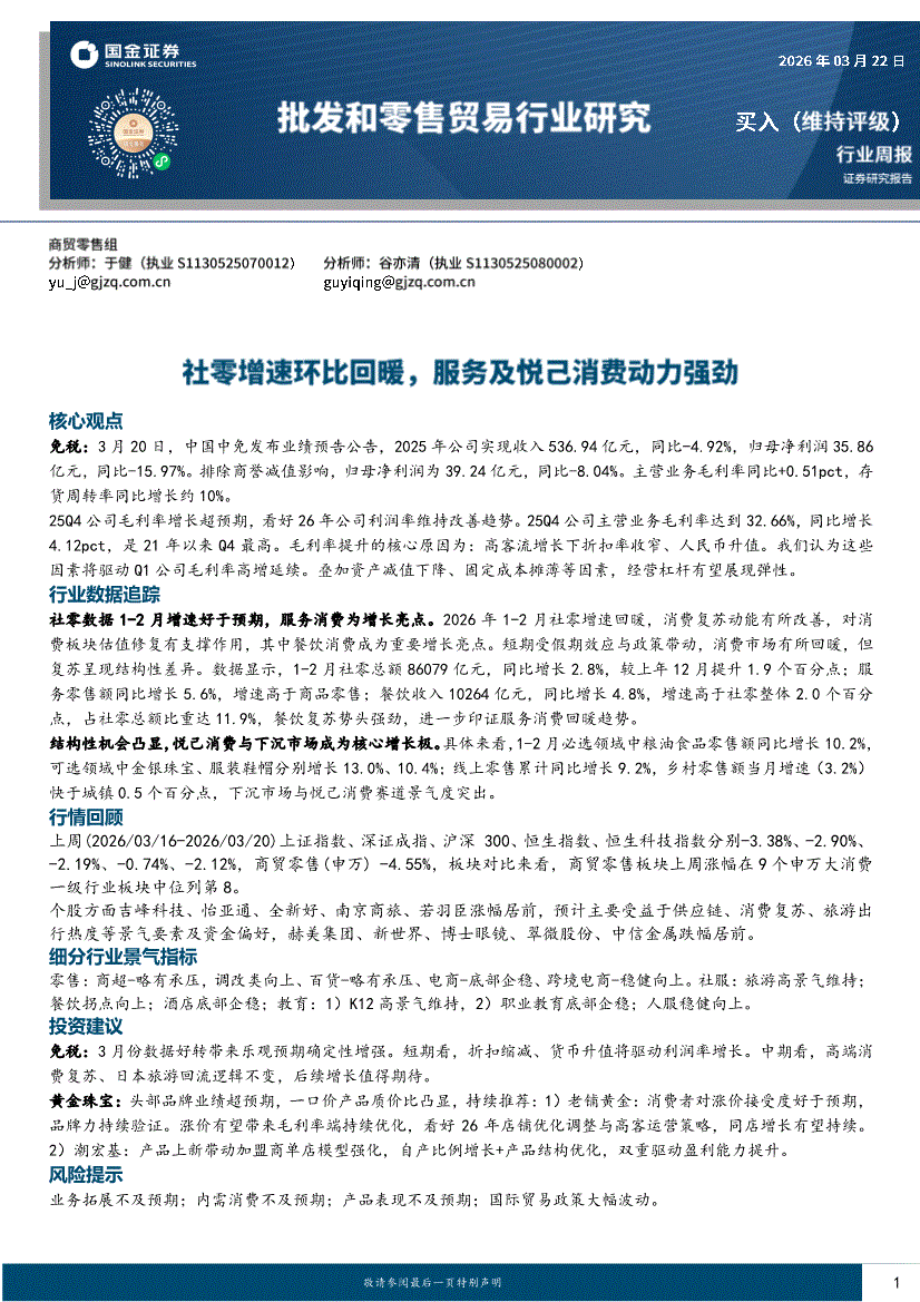 批发和零售贸易行业:国金证券-批发和零售贸易行业研究:社零增速环比回暖,服务及悦己消费动力强劲-260322