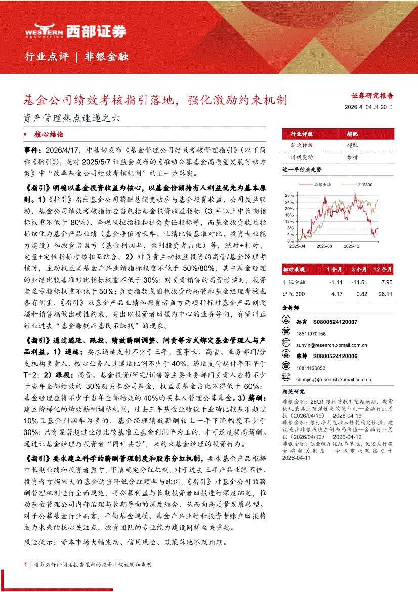 非银金融行业:西部证券-非银金融行业资产管理热点速递之六:基金公司绩效考核指引落地,强化激励约束机制-260420