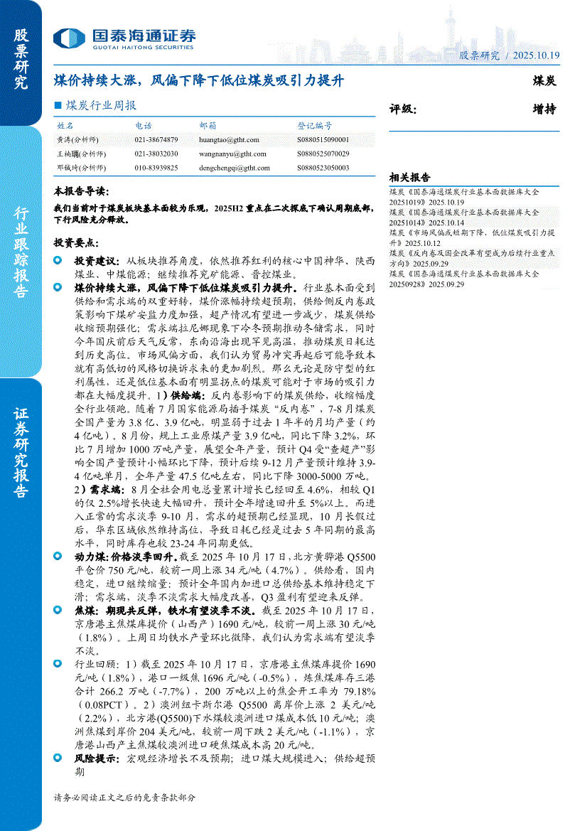 煤炭行业:国泰海通证券-煤炭行业周报:煤价持续大涨,风偏下降下低位煤炭吸引力提升-251019
