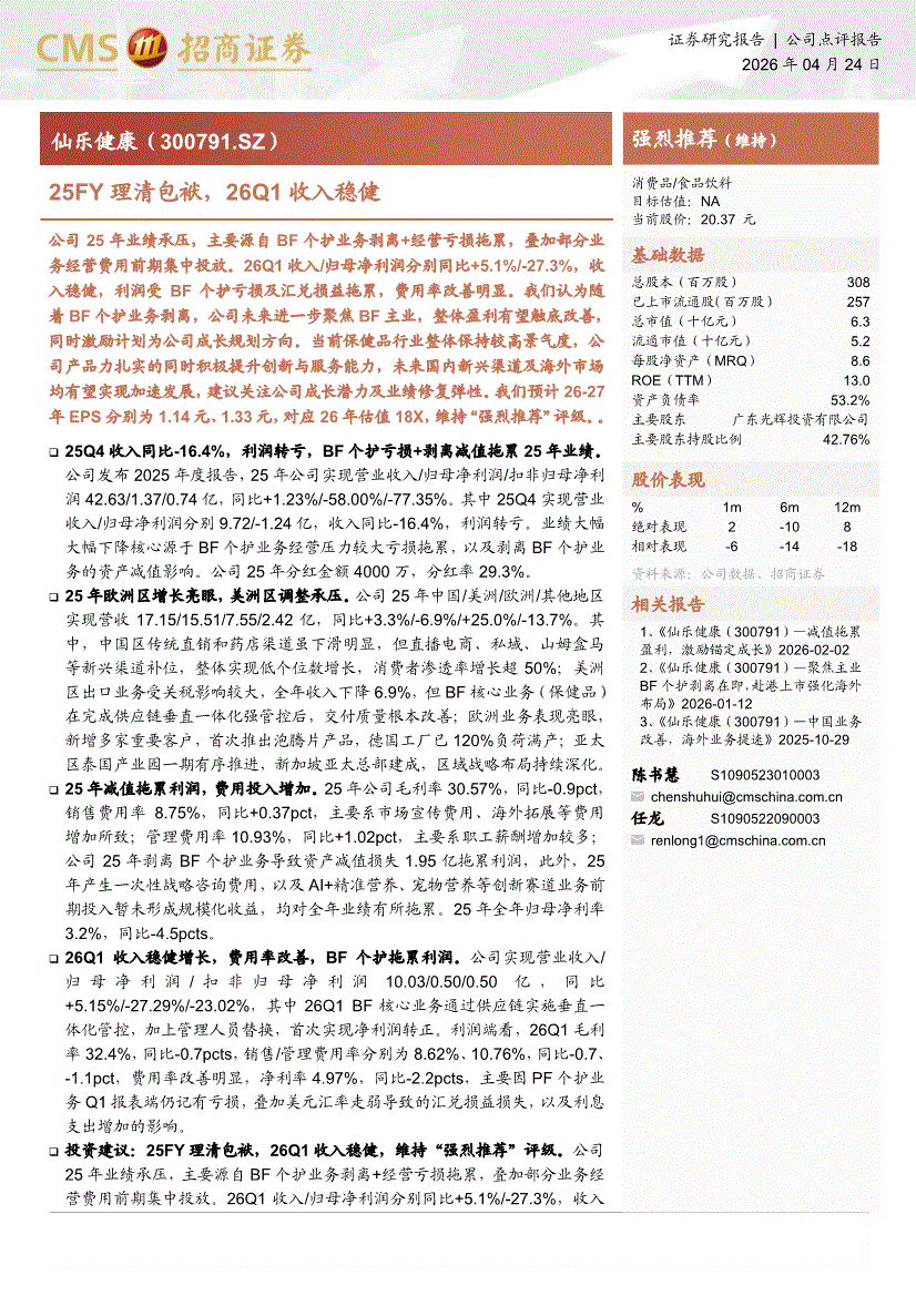 仙乐健康:招商证券-仙乐健康-300791-25FY理清包袱,26Q1收入稳健-260424