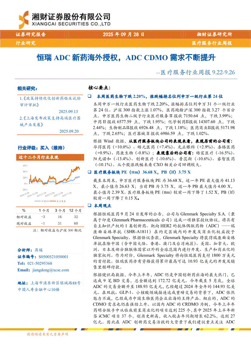 医疗服务行业:湘财证券-医疗服务行业周报:恒瑞ADC新药海外授权,ADC CDMO需求不断提升-250928
