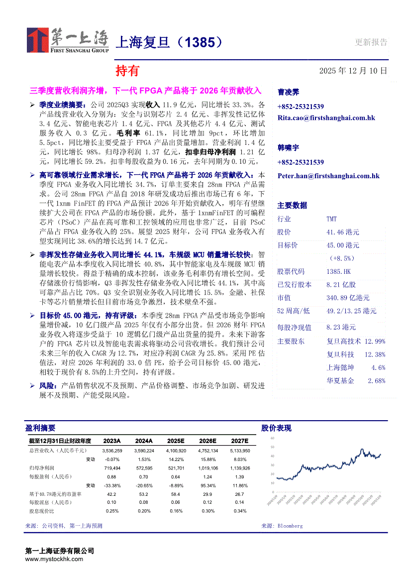 上海复旦:第一上海-上海复旦-1385.HK-三季度营收利润齐增,下一代FPGA产品将于2026年贡献收入-251210