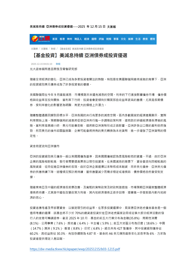 光大证券(国际)-文汇报:美减息持续,亚洲债券成投资优选-251215