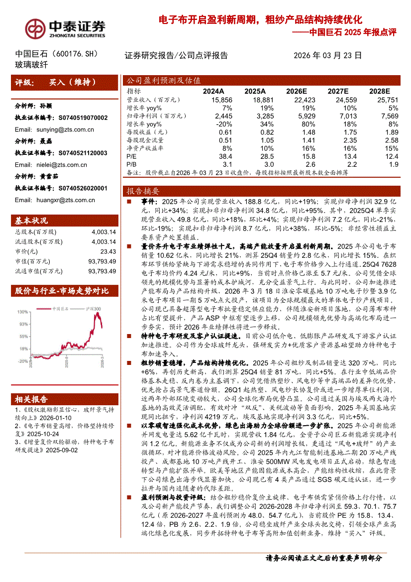 中国巨石:中泰证券-中国巨石-600176-2025年报点评:电子布开启盈利新周期,粗纱产品结构持续优化-260323