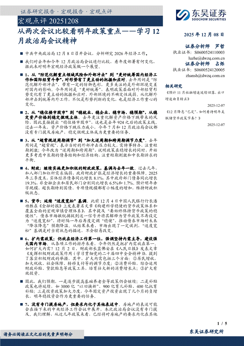 东吴证券-宏观点评:从两次会议比较看明年政策重点——学习12月政治局会议精神-251208
