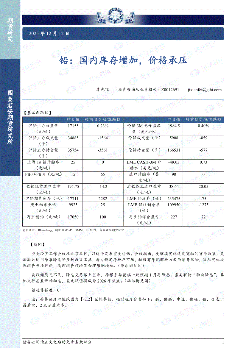 国泰君安期货-铅:国内库存增加,价格承压-251212