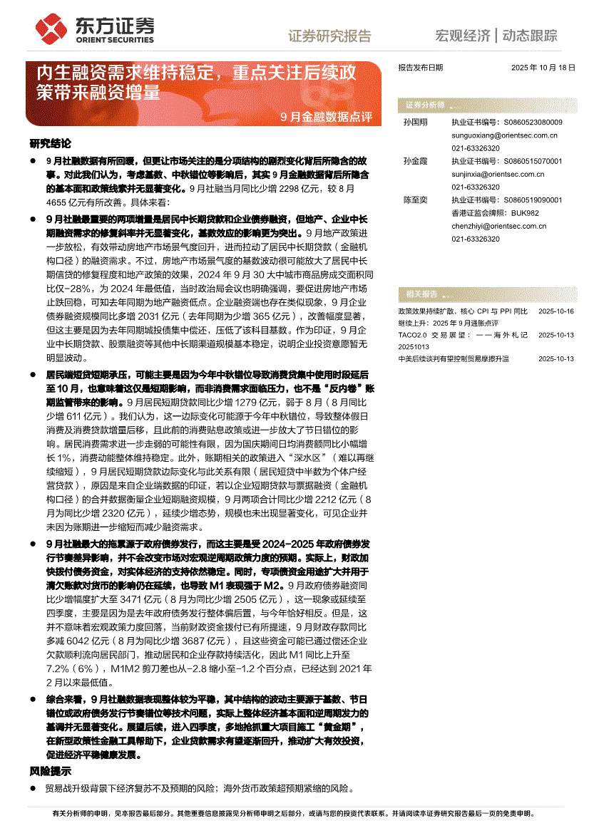 东方证券-9月金融数据点评:内生融资需求维持稳定,重点关注后续政策带来融资增量-251018