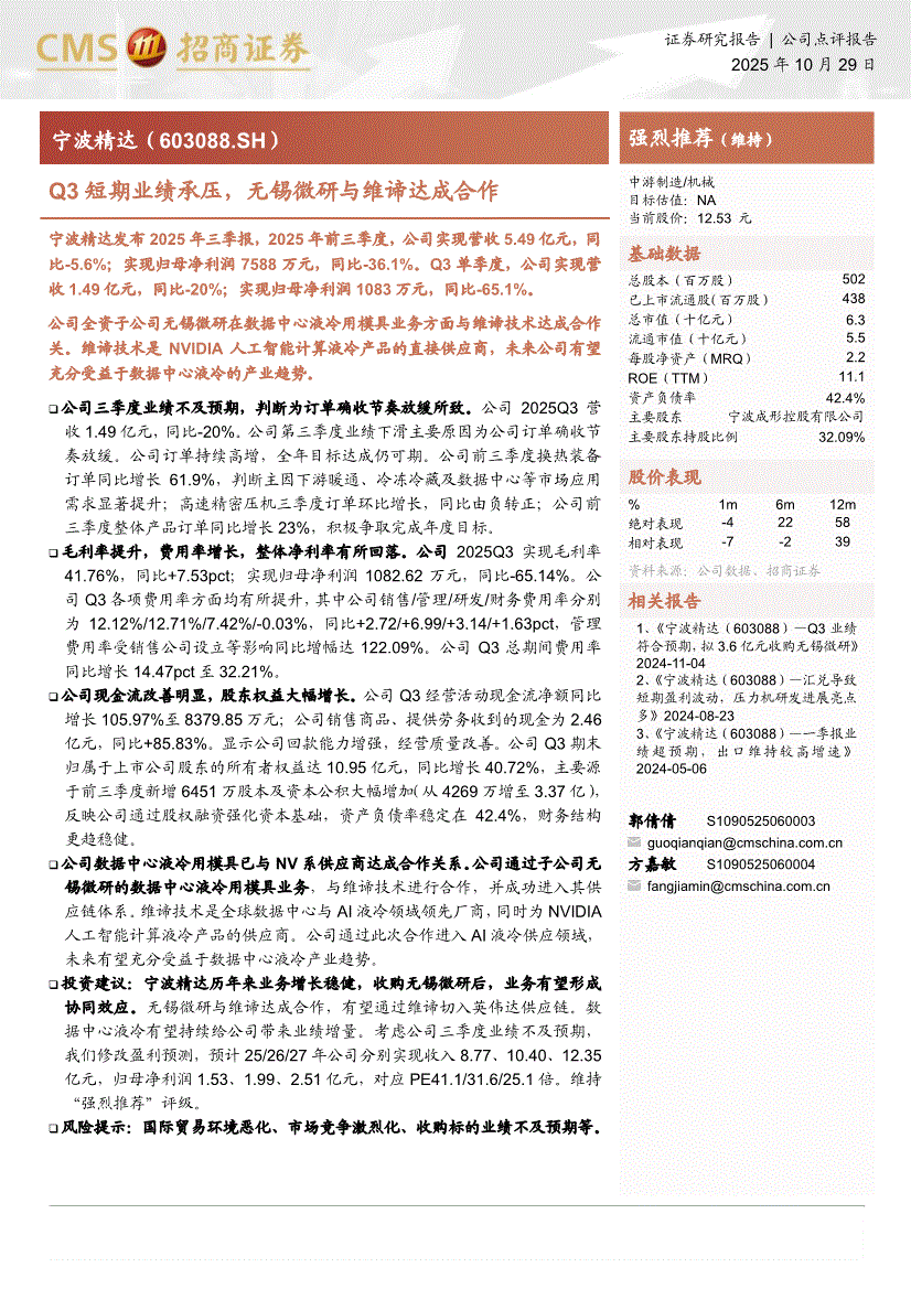 宁波精达:招商证券-宁波精达-603088-Q3短期业绩承压,无锡微研与维谛达成合作-251029