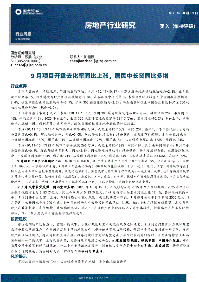 房地产行业:国金证券-房地产行业周报:9月项目开盘去化率同比上涨,居民中长贷同比多增-251019