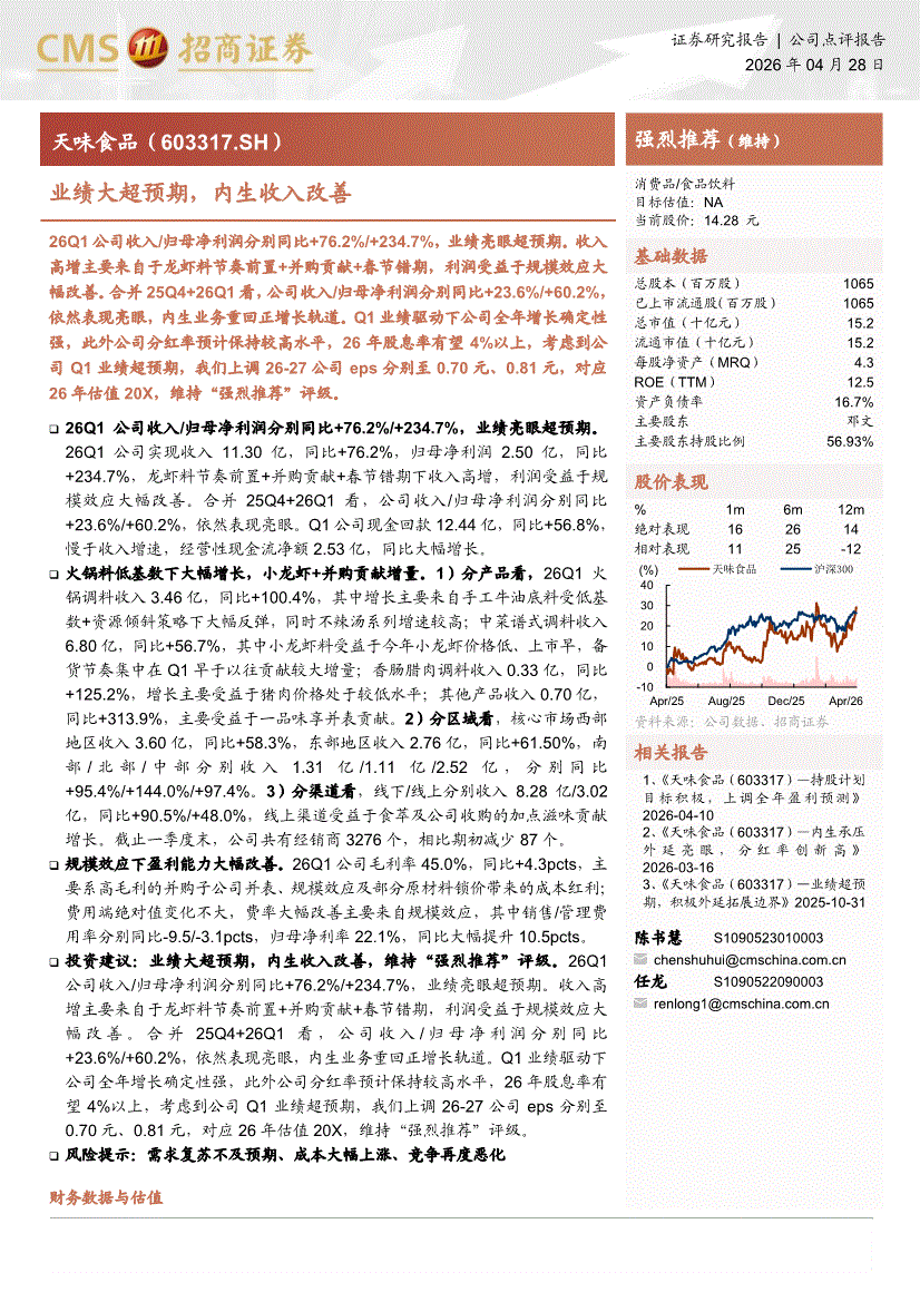天味食品:招商证券-天味食品-603317-业绩大超预期,内生收入改善-260428