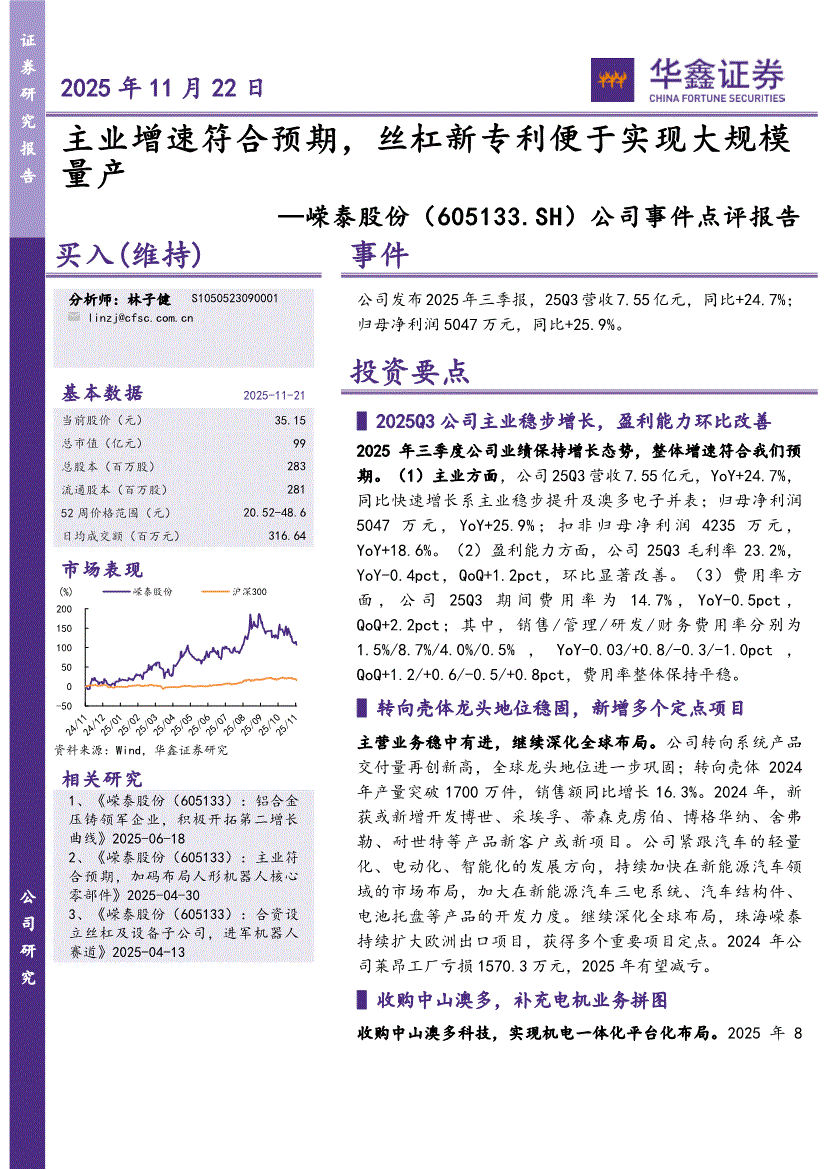 嵘泰股份:华鑫证券-嵘泰股份-605133-公司事件点评报告:主业增速符合预期,丝杠新专利便于实现大规模量产-251122