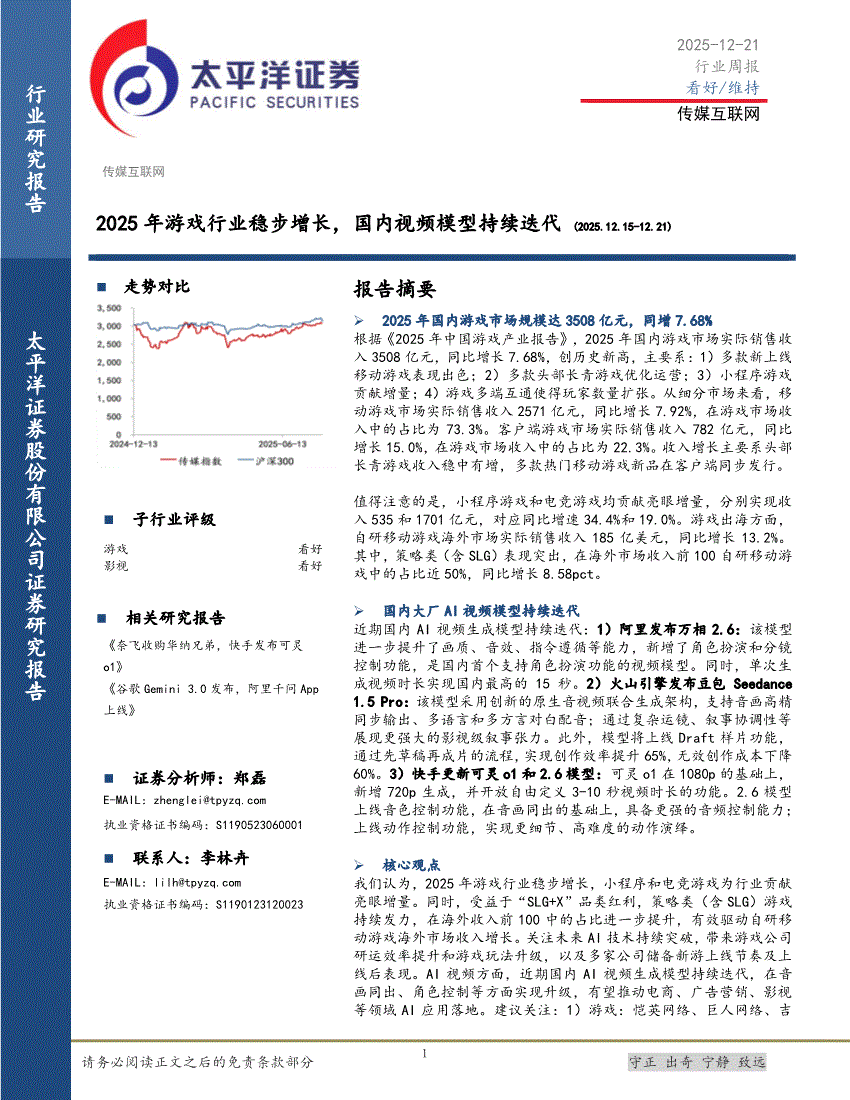 传媒互联网行业:太平洋证券-传媒互联网行业周报:2025年游戏行业稳步增长,国内视频模型持续迭代-251221