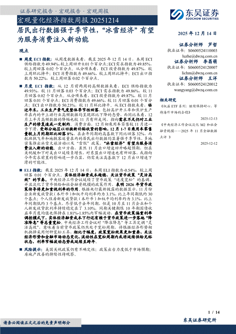 东吴证券-宏观量化经济指数周报:居民出行数据强于季节性,“冰雪经济”有望为服务消费注入新动能-251214