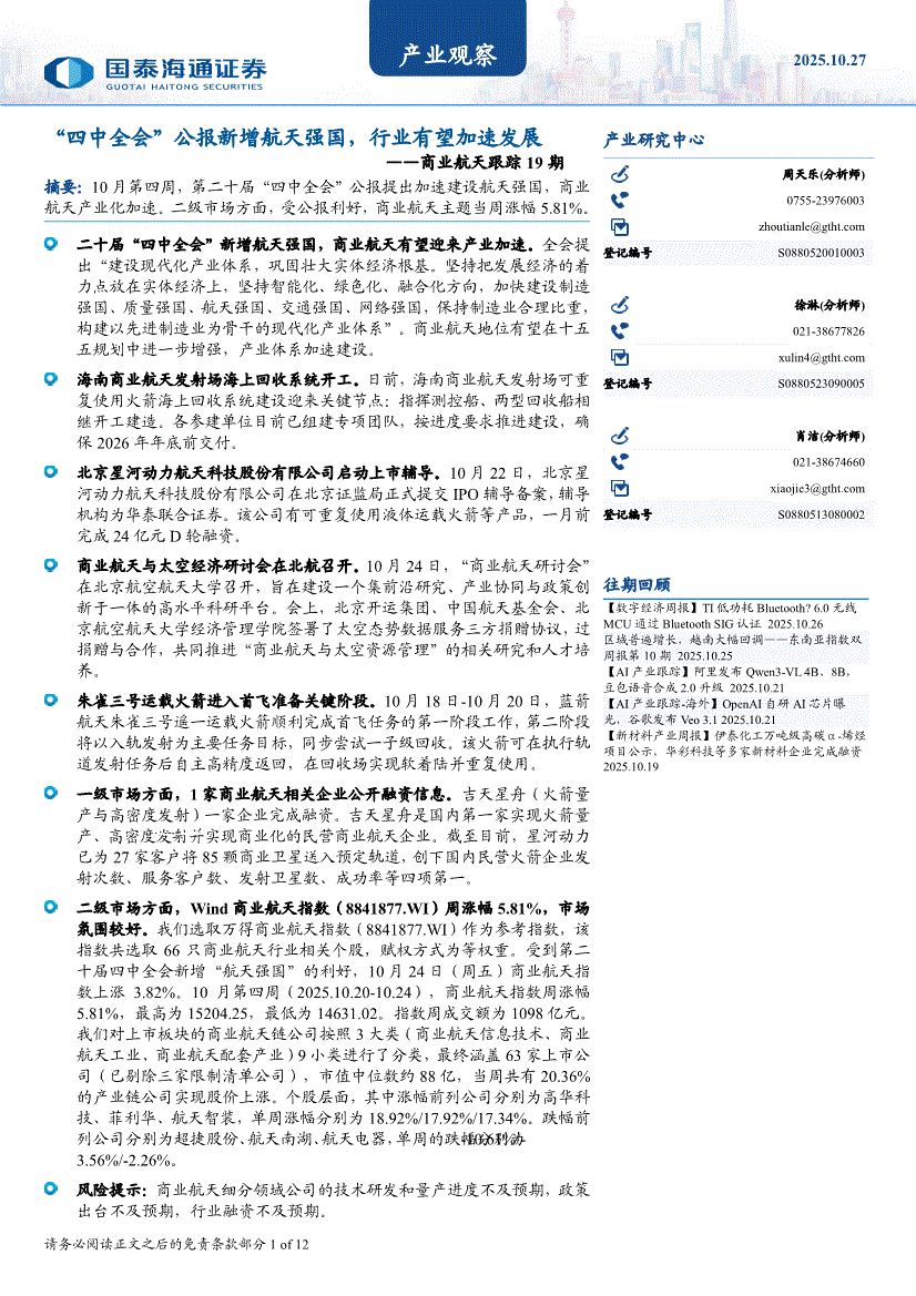 国泰海通证券-产业观察:商业航天跟踪19期,“四中全会”公报新增航天强国,行业有望加速发展-251027