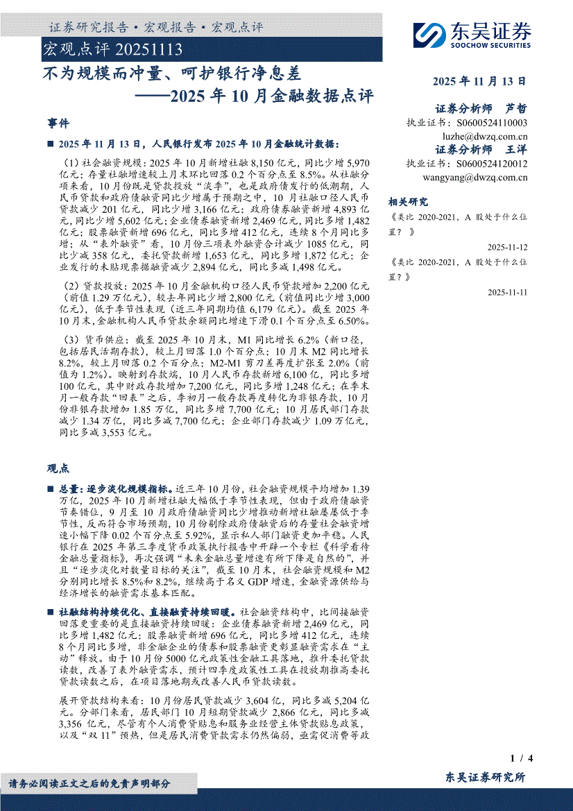 东吴证券-2025年10月金融数据点评:不为规模而冲量、呵护银行净息差-251113