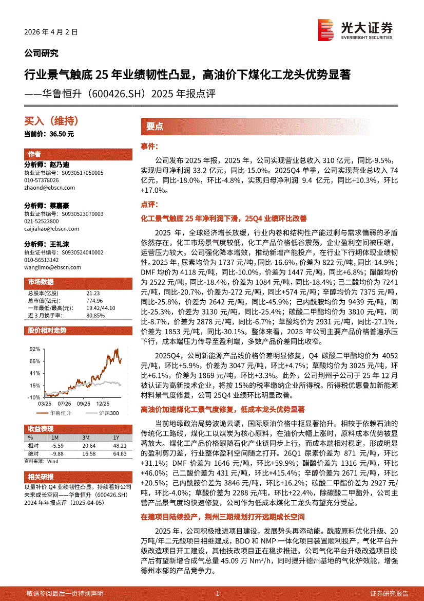 华鲁恒升:光大证券-华鲁恒升-600426-2025年报点评:行业景气触底25年业绩韧性凸显,高油价下煤化工龙头优势显著-260402