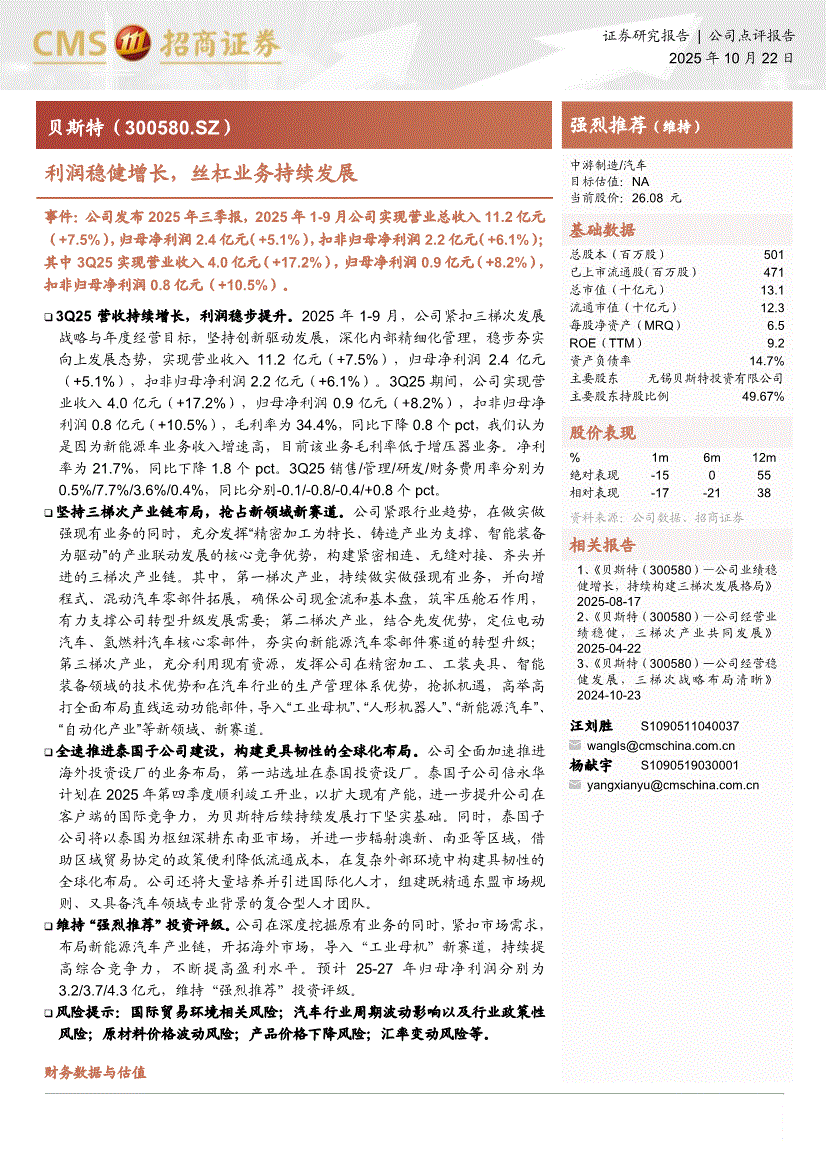 招商证券-贝斯特-300580-利润稳健增长,丝杠业务持续发展-251022