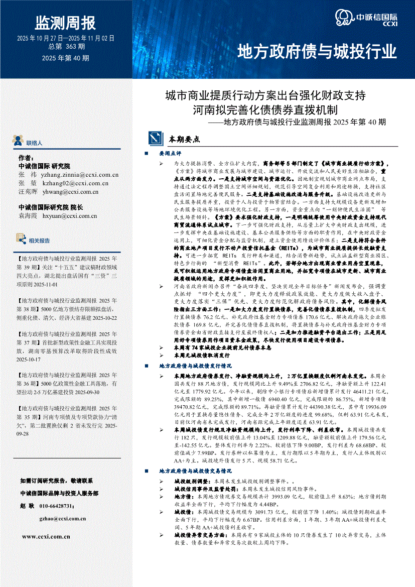 中诚信国际-地方政府债与城投行业监测周报2025年第40期:城市商业提质行动方案出台强化财政支持,河南拟完善化债债券直拨机制-251102