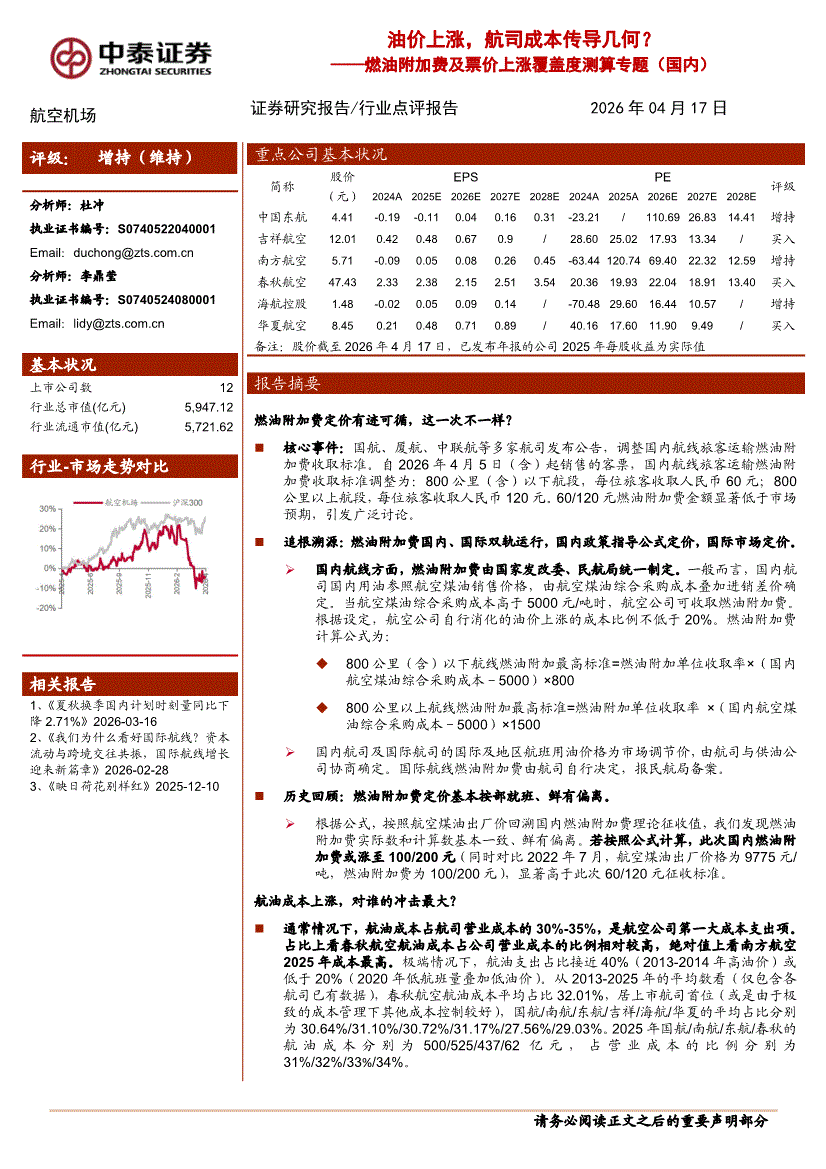 航空机场行业:中泰证券-航空机场行业燃油附加费及票价上涨覆盖度测算专题(国内):油价上涨,航司成本传导几何?-260417