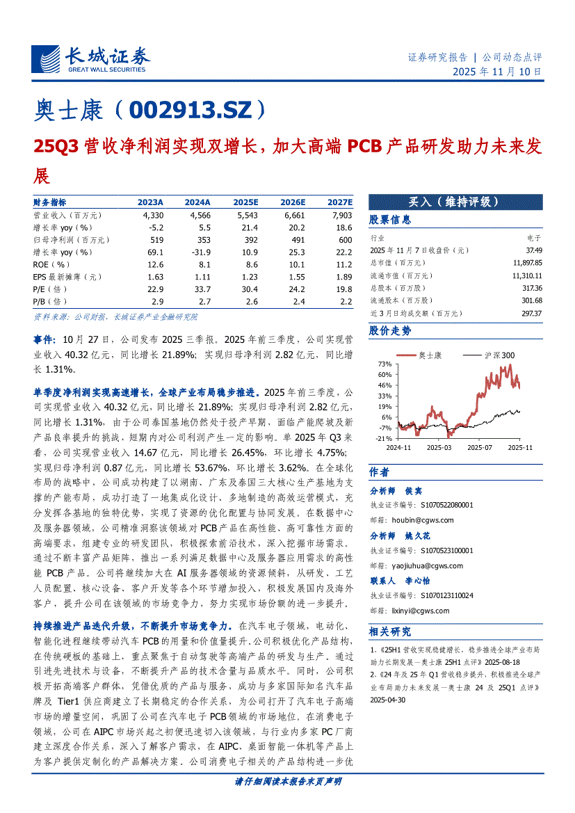 奥士康:长城证券-奥士康-002913-25Q3营收净利润实现双增长,加大高端PCB产品研发助力未来发展-251110