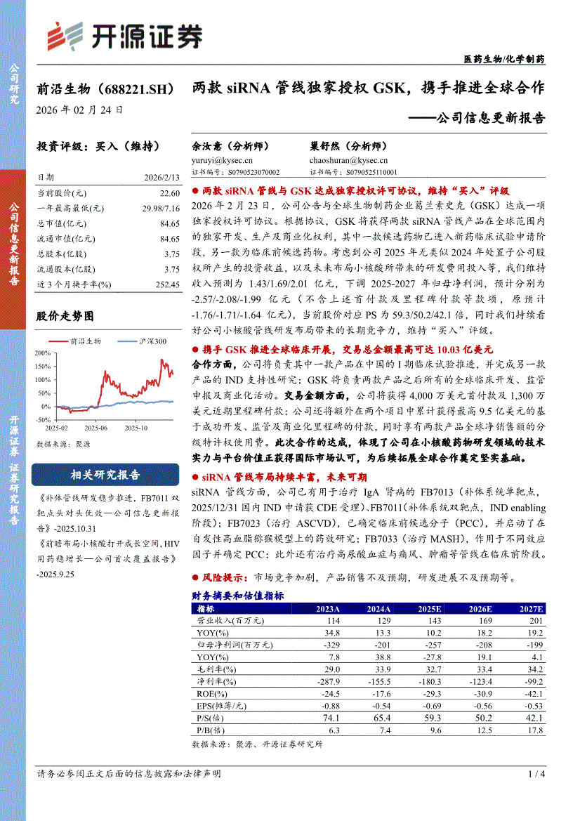 前沿生物:开源证券-前沿生物-688221-公司信息更新报告:两款siRNA管线独家授权GSK,携手推进全球合作-260224