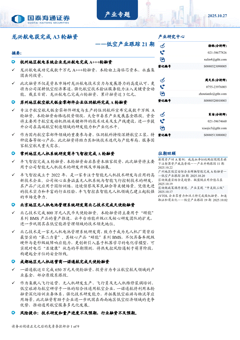 国泰海通证券-产业专题:低空产业跟踪21期,龙兴航电获完成A3轮融资-251027
