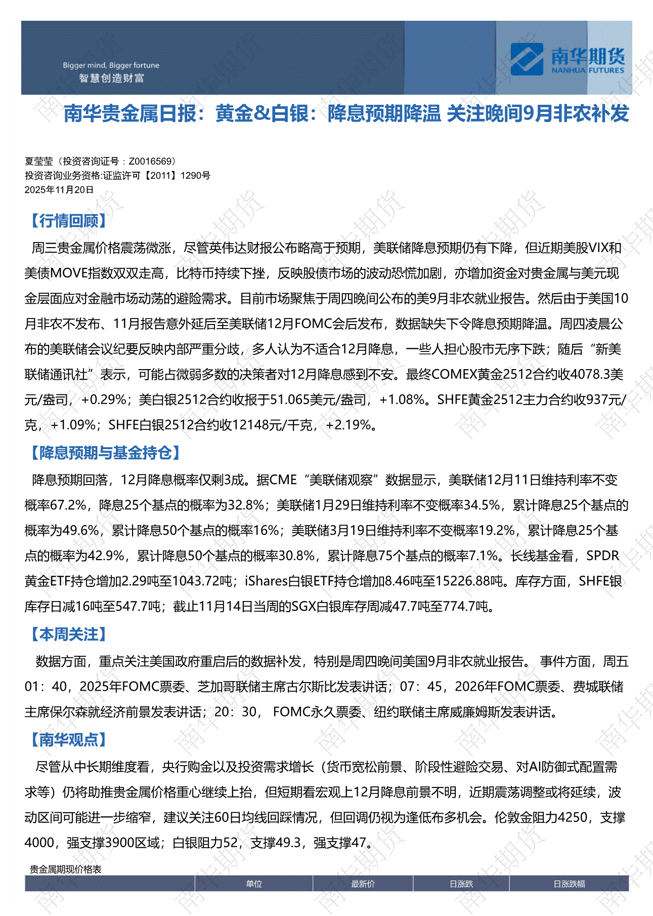 南华期货-贵金属日报:黄金&白银,降息预期降温,关注晚间9月非农补发-251120