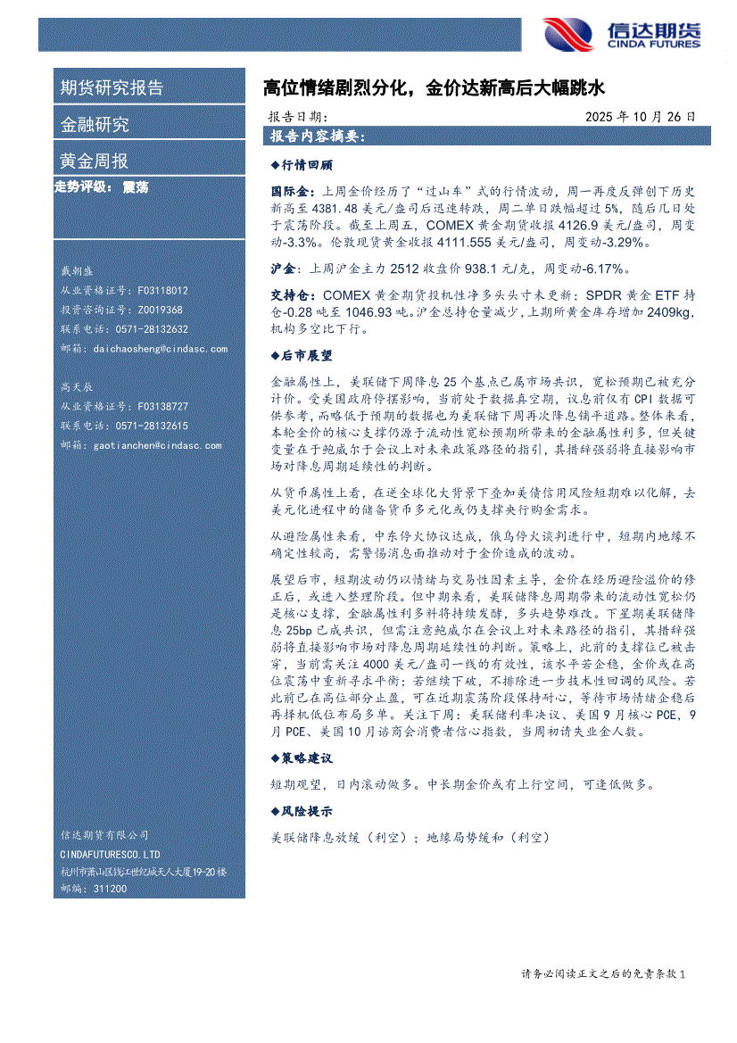 信达期货-黄金周报:高位情绪剧烈分化,金价达新高后大幅跳水-251026