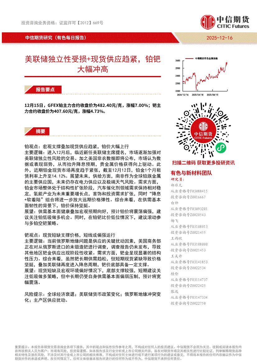 中信期货-有色每日报告:美联储独立性受损+现货供应趋紧,铂钯大幅冲高-251216