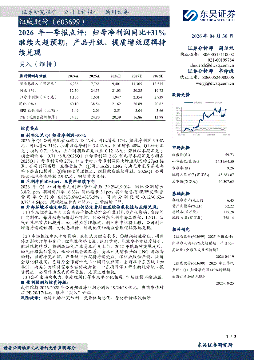 纽威股份:东吴证券-纽威股份-603699-2026年一季报点评:归母净利润同比+31%继续大超预期,产品升级、提质增效逻辑持续兑现-260430