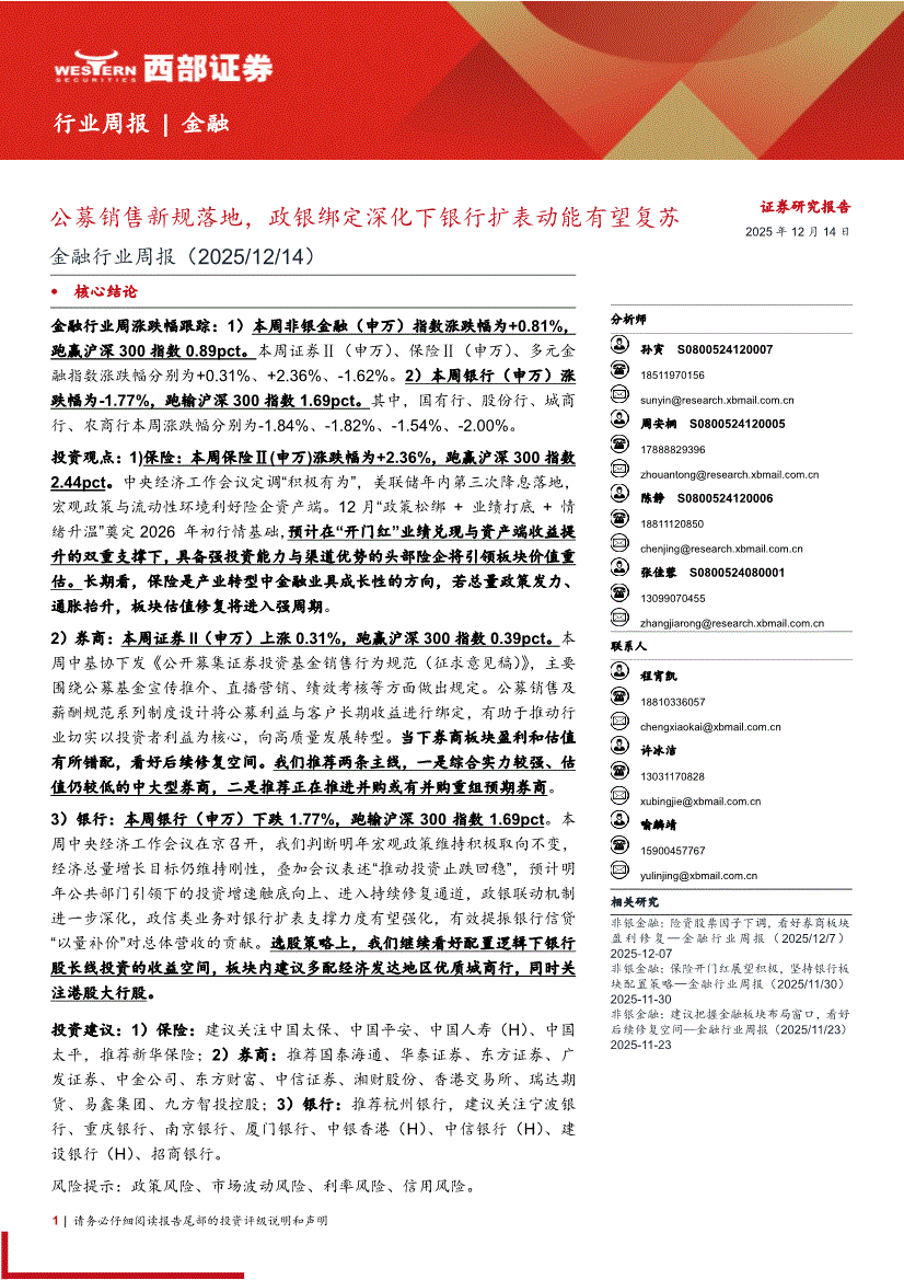 金融行业:西部证券-金融行业周报(2025/12/14):公募销售新规落地,政银绑定深化下银行扩表动能有望复苏-251214