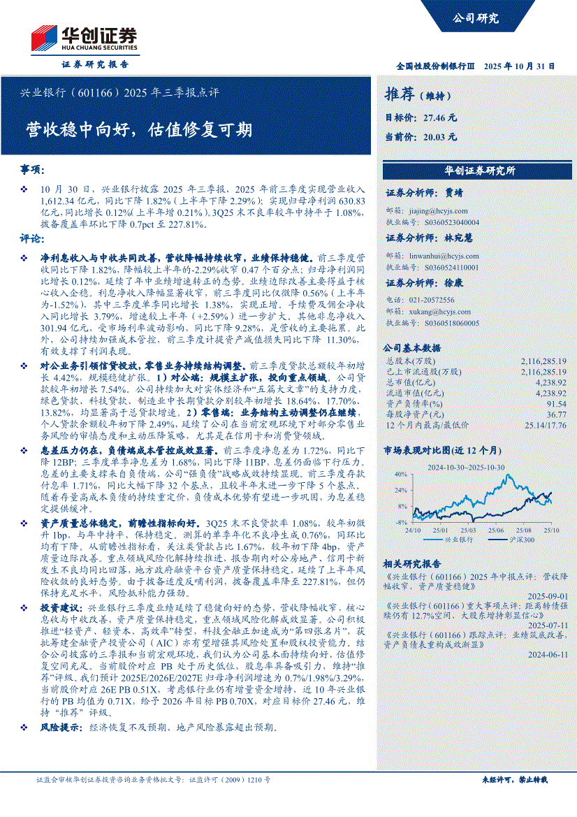 兴业银行:华创证券-兴业银行-601166-2025年三季报点评:营收稳中向好,估值修复可期-251031