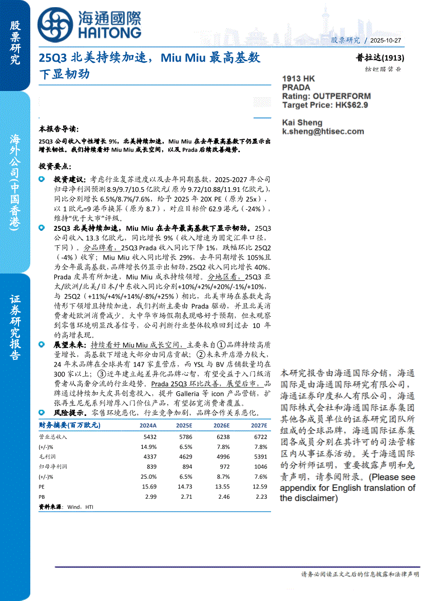 普拉达:海通国际-普拉达-1913.HK-25Q3北美持续加速,Miu Miu最高基数下显韧劲-251027