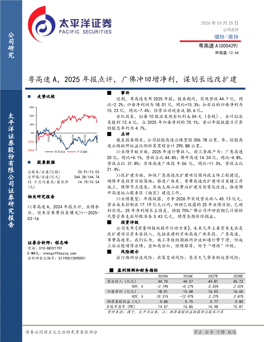 粤高速A:太平洋证券-粤高速A-000429-2025年报点评:广佛冲回增净利,谋划长远改扩建-260325