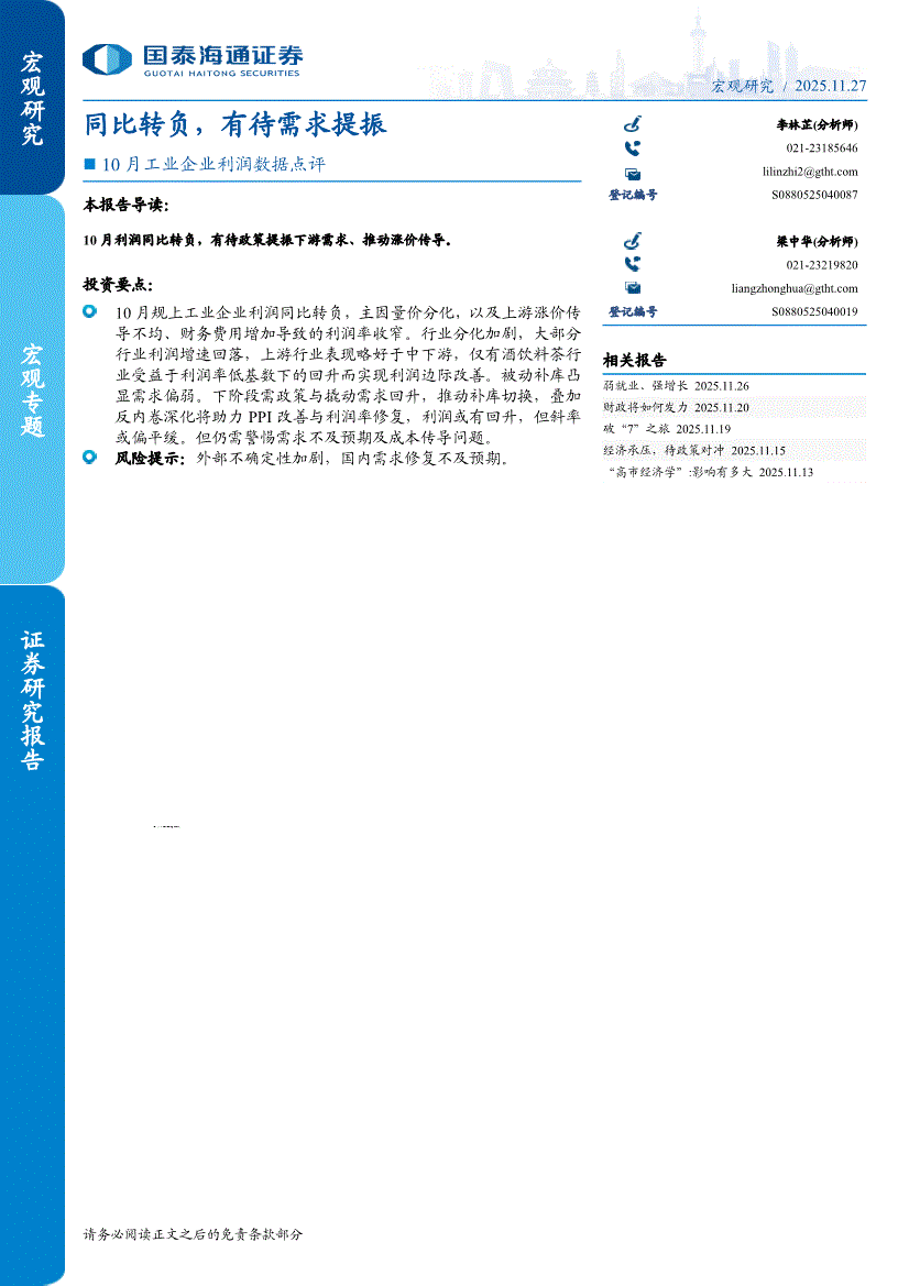 国泰海通证券-10月工业企业利润数据点评:同比转负,有待需求提振-251127