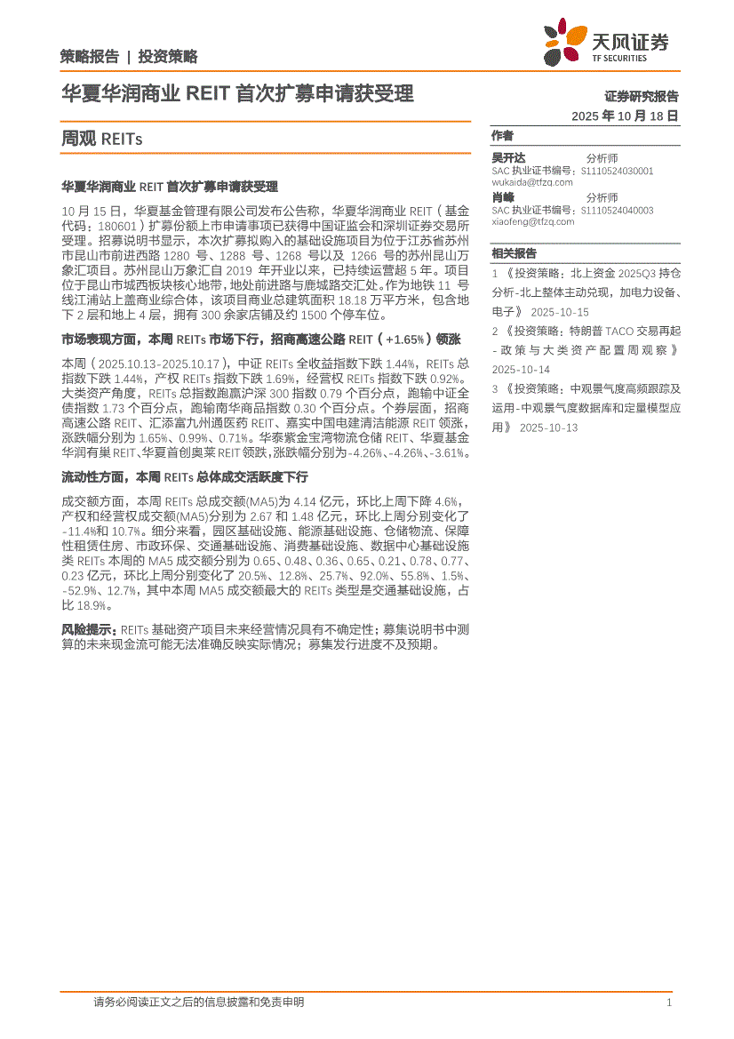 天风证券-周观REITs:华夏华润商业REIT首次扩募申请获受理-251018