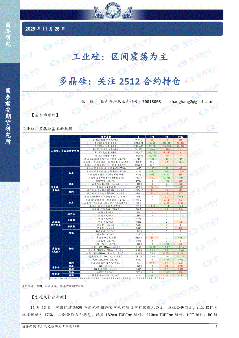 国泰君安期货-工业硅:区间震荡为主,多晶硅,关注2512合约持仓-251128