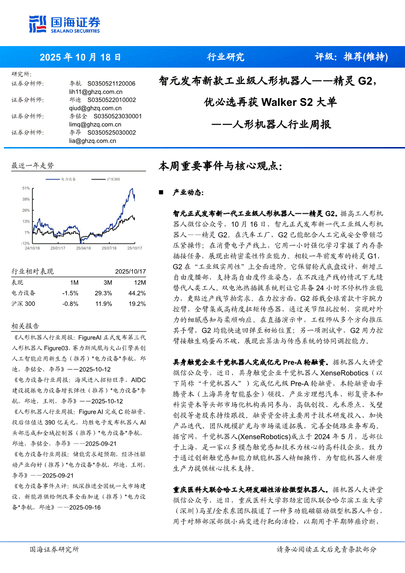 人形机器人行业:国海证券-人形机器人行业周报:智元发布新款工业级人形机器人——精灵G2,优必选再获Walker S2大单-251018