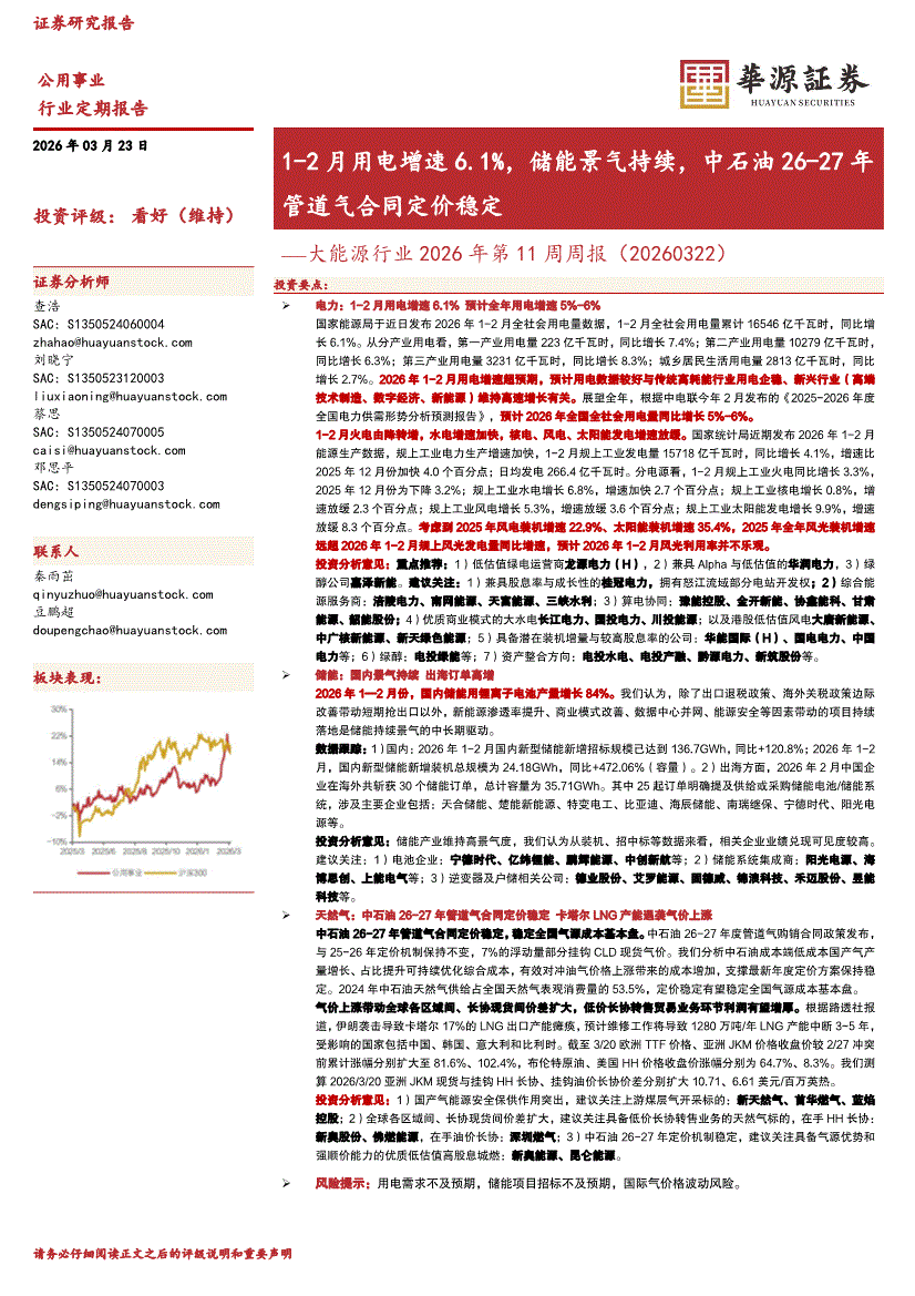 大能源行业:华源证券-大能源行业2026年第11周周报:1~2月用电增速6.1%,储能景气持续,中石油26~27年管道气合同定价稳定-260323